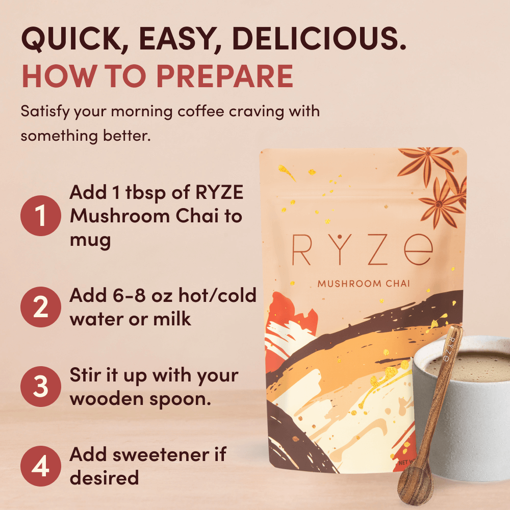 Savor the flavor of delicious chai while also giving your body and mind a boost. RYZE Chai is packed with 6 adaptogenic mushrooms and warming Ayurvedic spices to deliver balanced energy, better focus, and immune support.